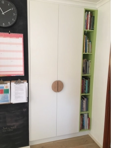 Sometimes, the smallest design elements can transform a space, adding both functionality and aesthetic charm. This is clearly evident in the bespoke handles on this modern wardrobe. Crafted from Victorian Ash, these curved half-moon handles add a unique touch that seamlessly blends with the minimalist design of the room.